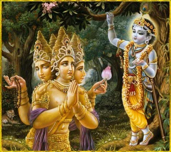 This introduced doubt in the heart of Sri Brahma, who is considered as the highest Brāhmaṇa. So Lord Brahma decided to test the lad known as Govinda, who moved around the land of Vraja (Vrindavan) without care or concern. It is also mentioned in the Bhagavat Mahapurana that Sri Brahma stole the cow herd friends and the cows of Lord Govinda, and transported them to Brahmaloka.