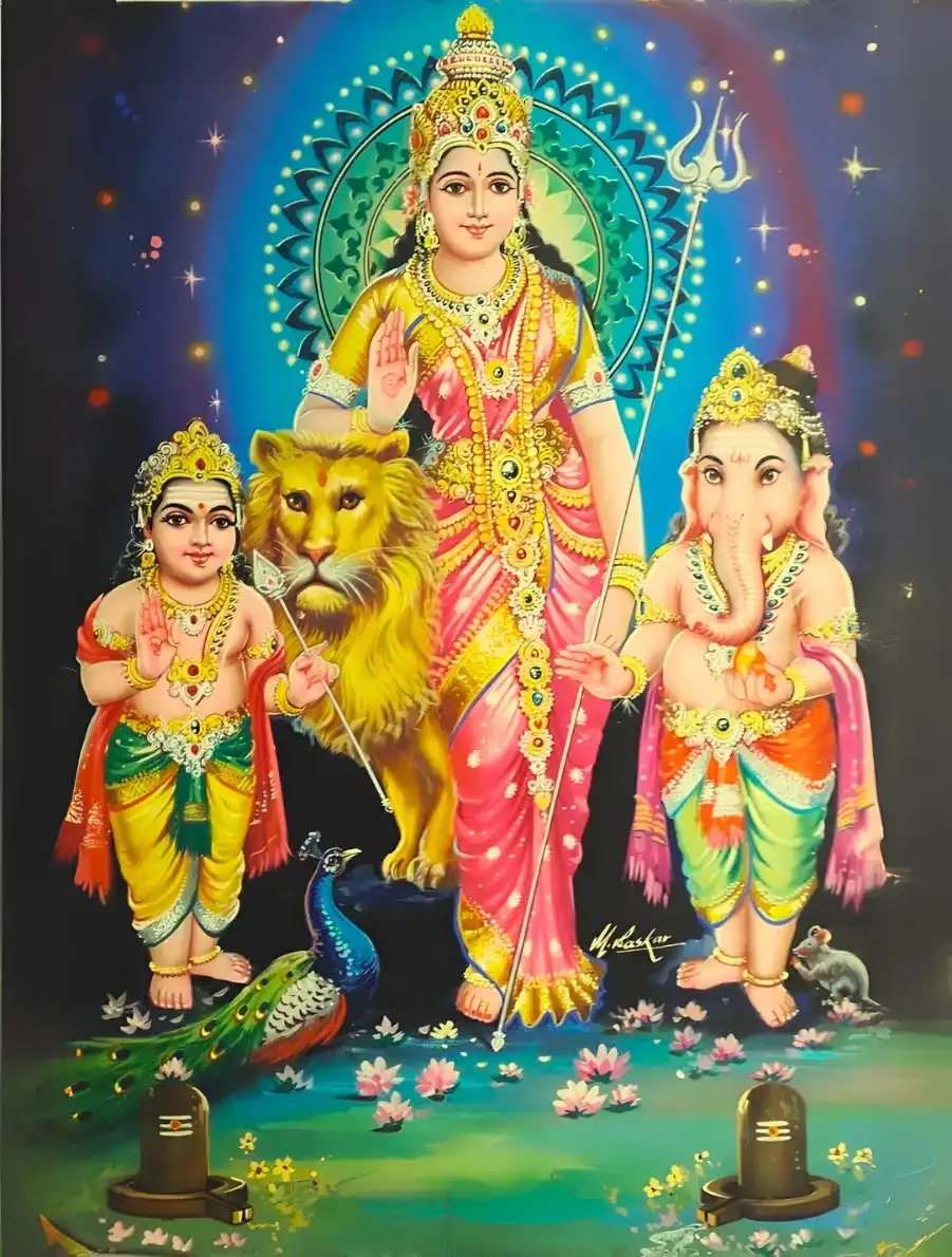 She emerged from the wrath of the trinity and thus is the very symbol of power and courage. Her very appearance caused the worlds to tremble. Devi is the very epitome of strength and courage.