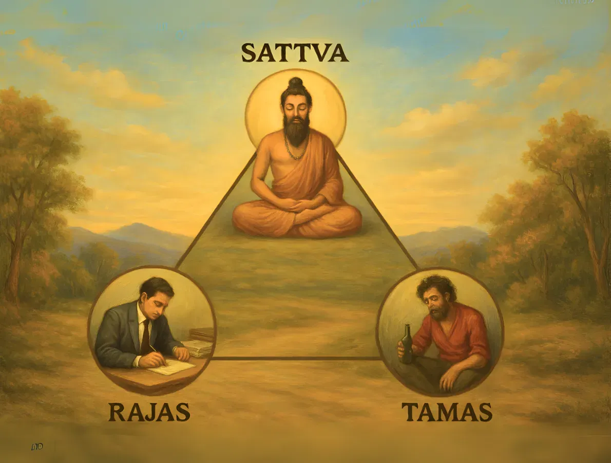 A triangle within the yantra embodies the divine feminine (Shakti) or Prakriti. The trigunas—Sattva, Rajas, and Tamas, which are the threefold constituents of Prakriti—are highlighted by the 3 points of the triangle.