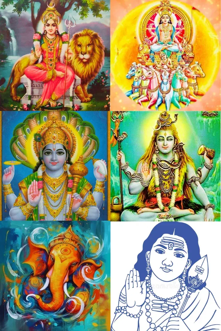 The word Ganesha literally means the chief of all the Shivaganas. He is also known as Lambodara. Chanting the Ganesha Sahasranama wards off evil spirits and brings success into our lives. Due to the different moods of the devotees, the Supreme Being presents himself in 6 different forms to attract the minds of people. The 6 principal deities are Lambodara, Surya, Mahashakti, Shiva, Narayana and Karthikeya.