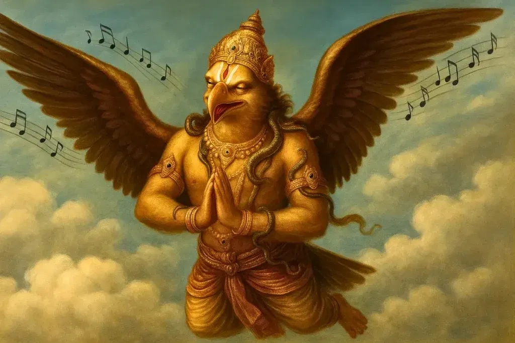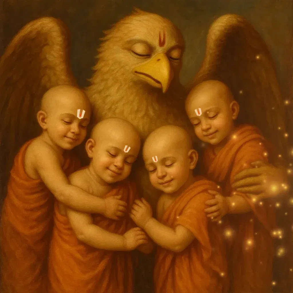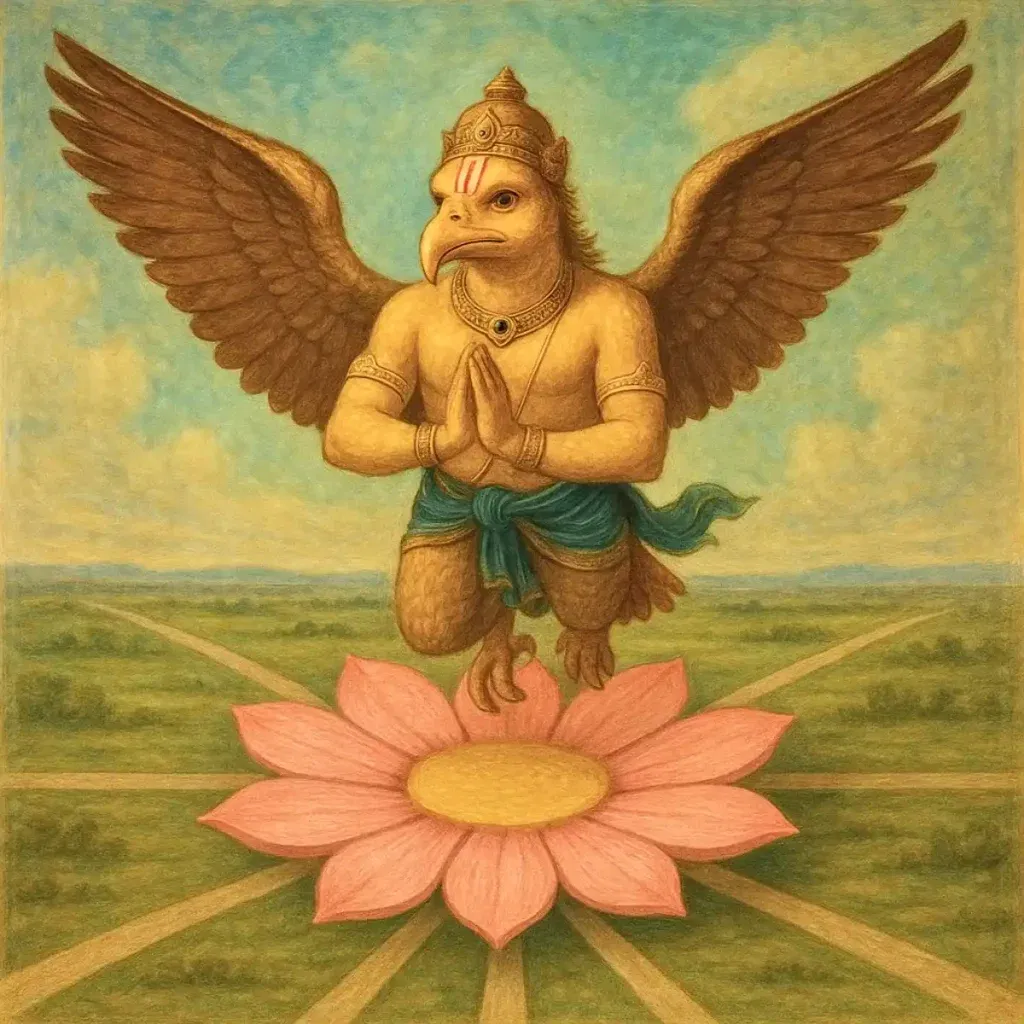 The scriptures describe Sri Garuda as an Aṃśāvatāra of Lord Narayana Himself. Indeed, who other than the Supreme Lord could bear the weight of the Supreme? Only Hari can hold Hari. This profound truth hints that Garuda is not merely the divine vehicle of Vishnu but a direct expansion of the Lord.