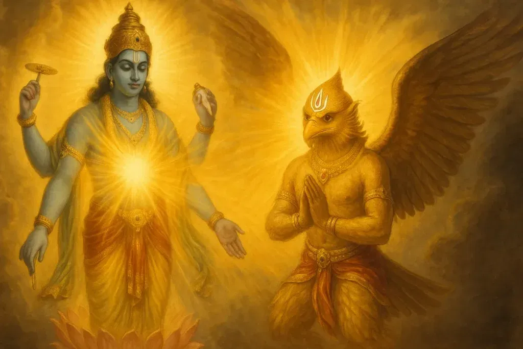 When Lord Narayana beheld the rare union of tremendous power and absolute selflessness in Sri Garuda, His heart was deeply moved. After the fierce battle with Indra, when Garuda seized the pot of Amrita, He had every opportunity to partake of it.