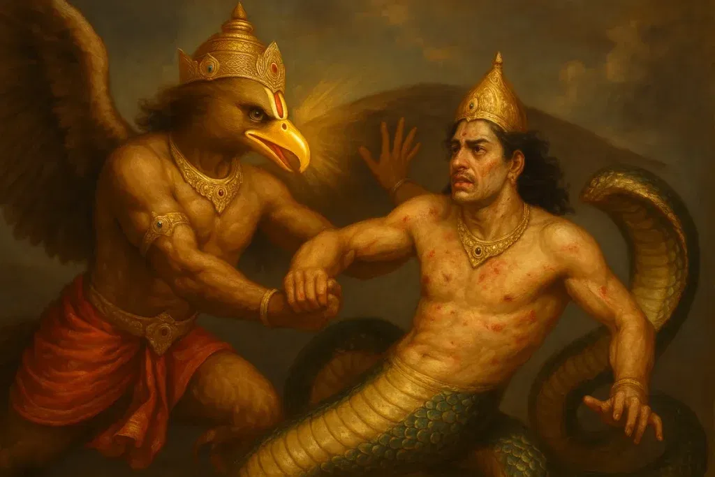 Angered by his arrogance, the sages cursed him, declaring that his pride would one day be shattered by a manifestation of Saṅkarṣaṇa. O Garuḍa, thus you fulfilled that prophecy completely. You became the very Lord of Death to the powerful serpents who dared to challenge you and subdued them with ease.