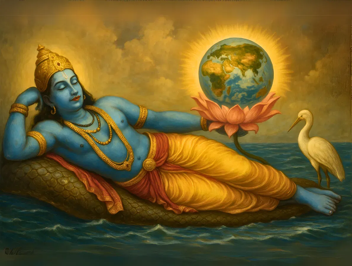 The Supreme Being manifested waters (known as Nārā in Sanskrit) and sowed seeds to commence the creation of the universe. He rested upon it and is, therefore, also known as Narayana.