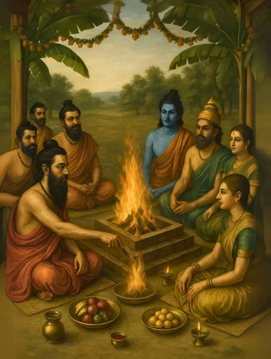Alongside lightning, rainbows, rain, etc, were also created. To maintain sanctity in the cosmic creation, yajnas were introduced. For this purpose, Sri Brahmā created the sacred Vedas and their chants — Rig, Yajur, and Sāma — specifically to initiate and empower sacred Yajna rituals.