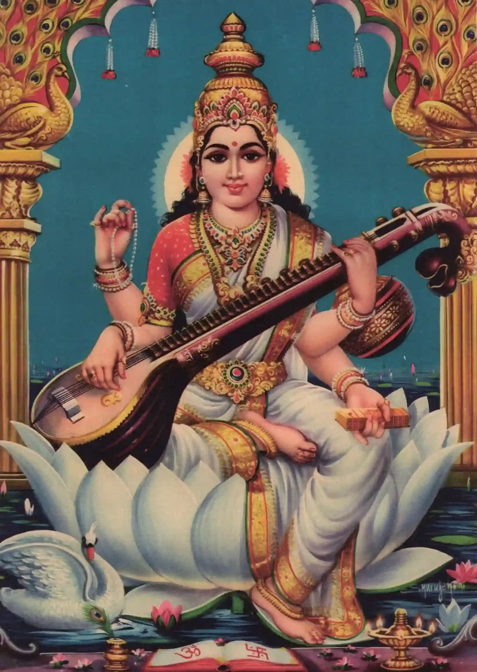 Knowledge here is divinity. The object of Knowledge, namely the book or reservoir of Knowledge represents the sense-object. Saraswati Devi triggers Knowledge by the Power of Her Divinity.