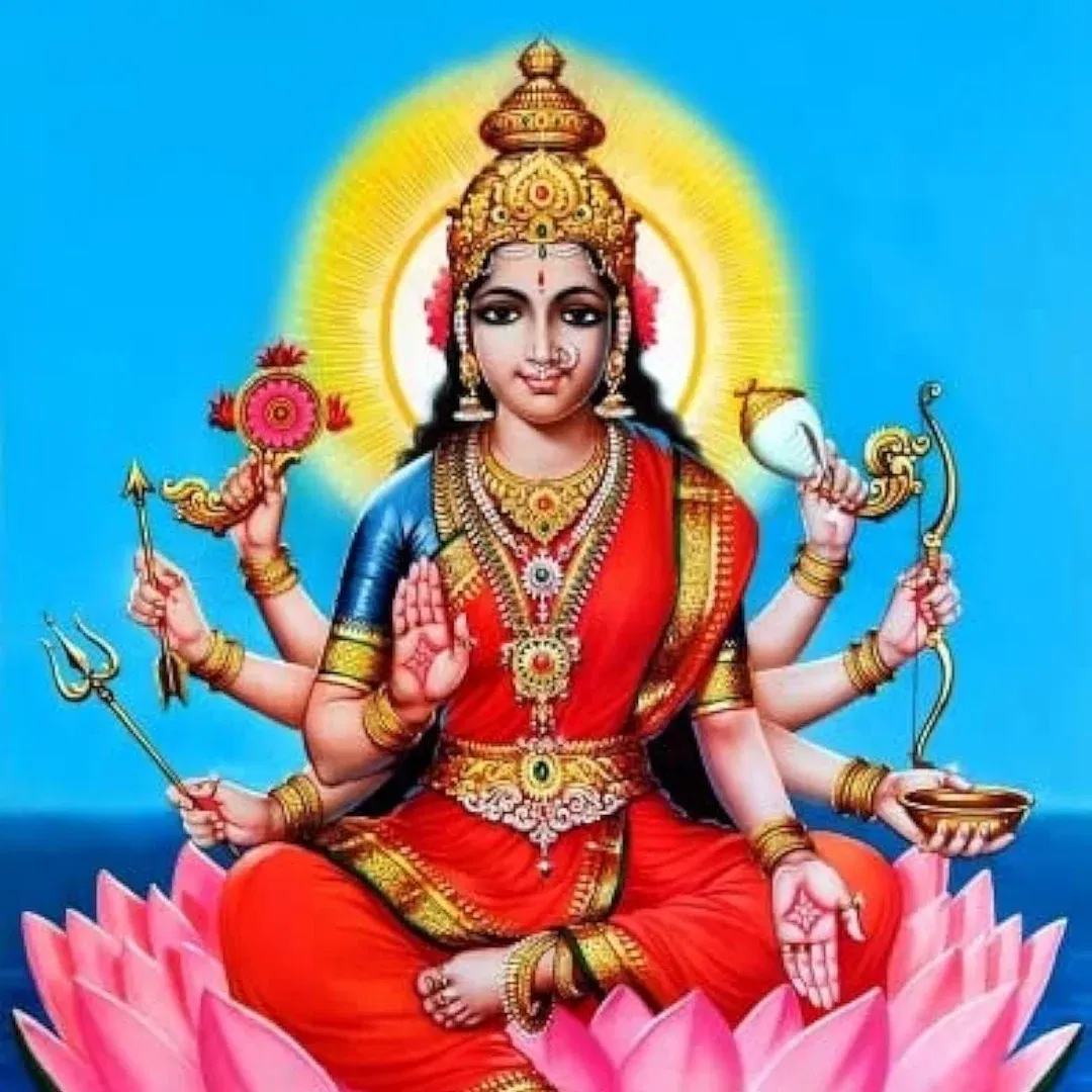 The eighth form of Lakshmi Devi is Vijaya Lakshmi. Vijaya means victory. She is the eight-handed goddess wielding the Sudarshan chakra, conch, sword, shield, noose, and lotus.