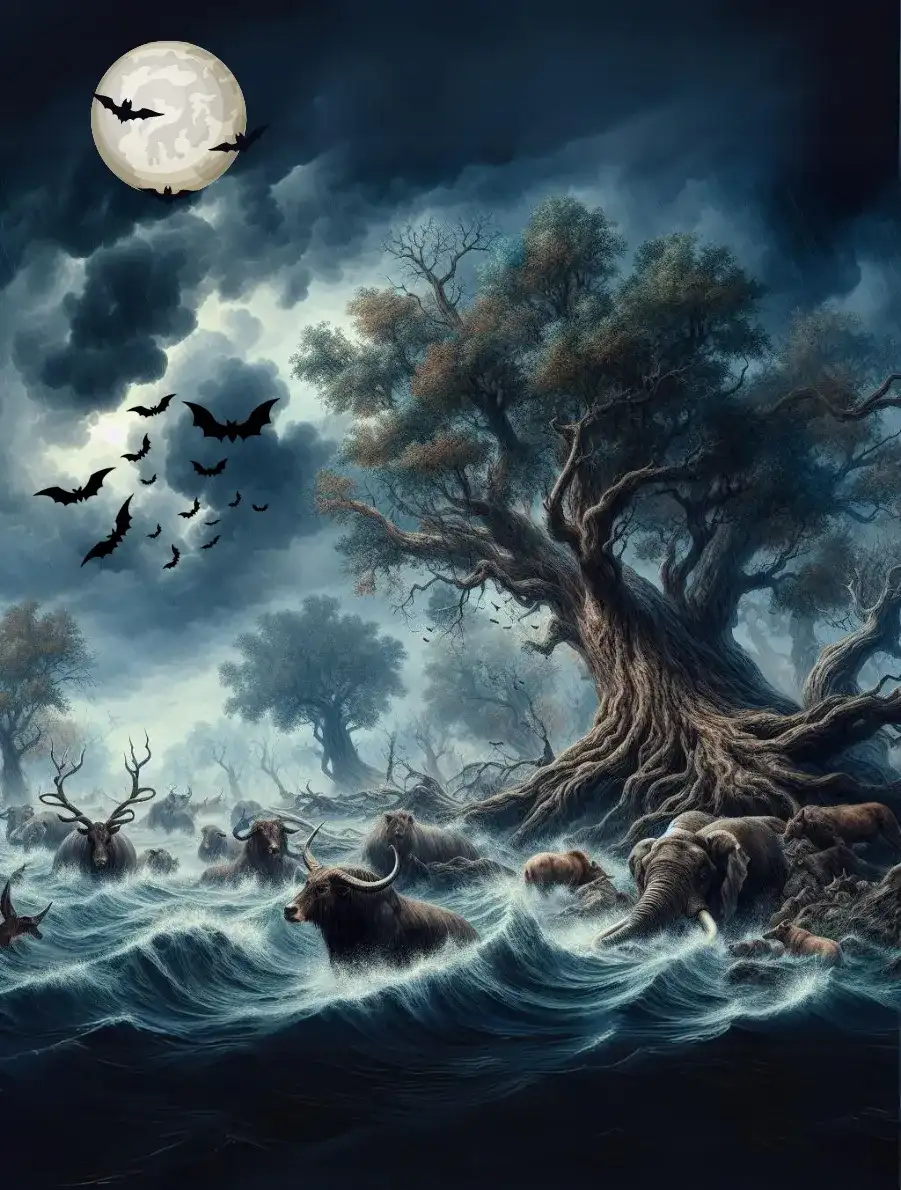 The entire earth drowned in the ocean waters. The 4 directions were flooded with water which ultimately destroyed flora and fauna. Huge mountains and trees, lifelessly floated on the contaminated waters of the ocean.