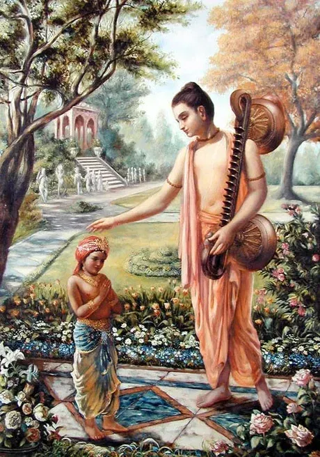 When Suruchi (the stepmother) reprimanded Maharaja Dhruva, he proceeded towards the forest to perform austerities to attain the Lord. Sage Narada met him on his way. He initiated Dhruva into the mantra, “Om Namo Bhagavathe Vasudevaya” and instructed him on the path of penance.