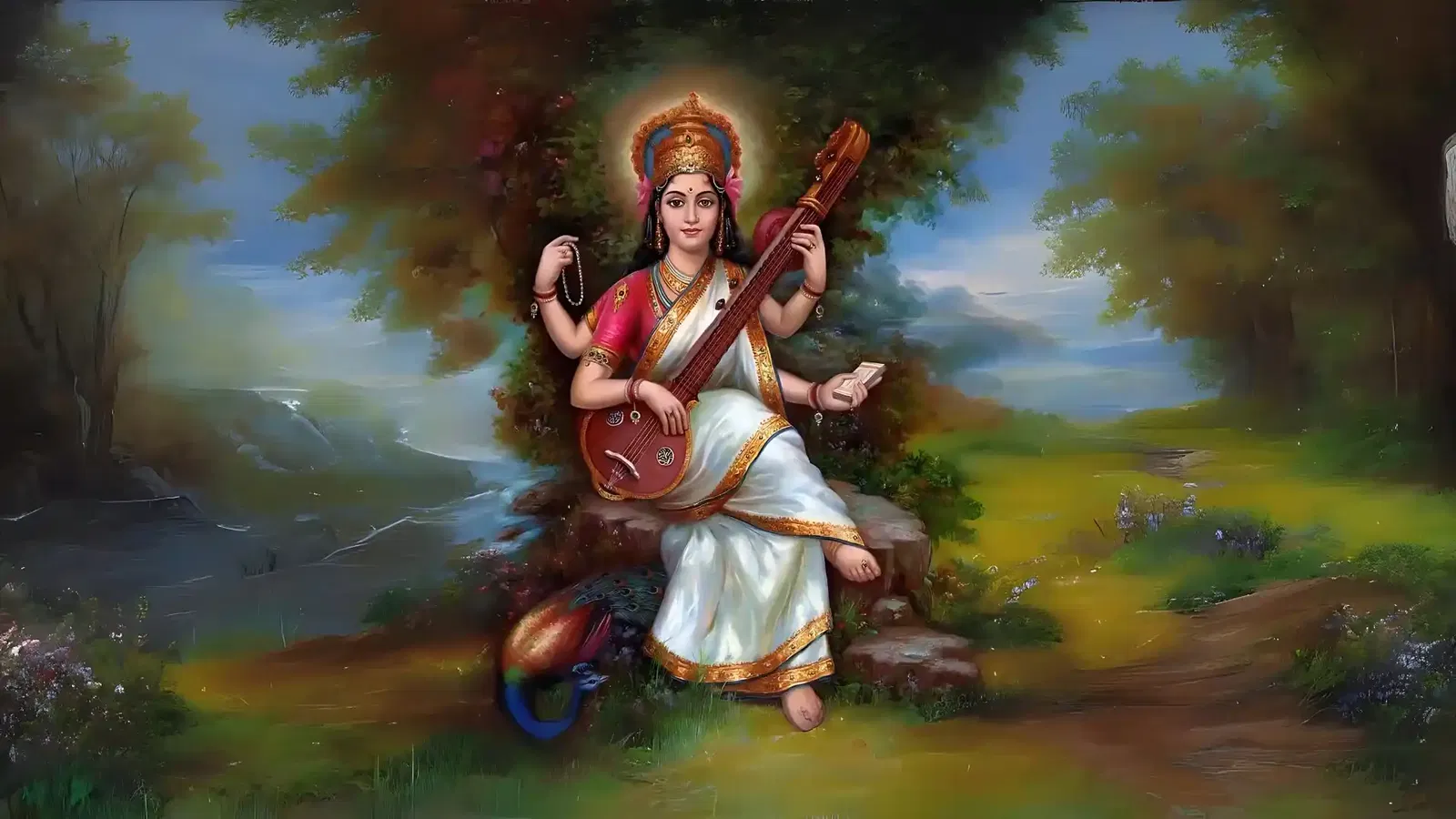 Know that Devi Saraswati is pleased with humility. That is the premise to success in any endeavour. She is also very merciful. Touched by Kalidas’s plight, she blessed him with poetic and scholastic abilities. A peacock stands by her side and sometimes she is shown wearing a peacock feather on her crown.