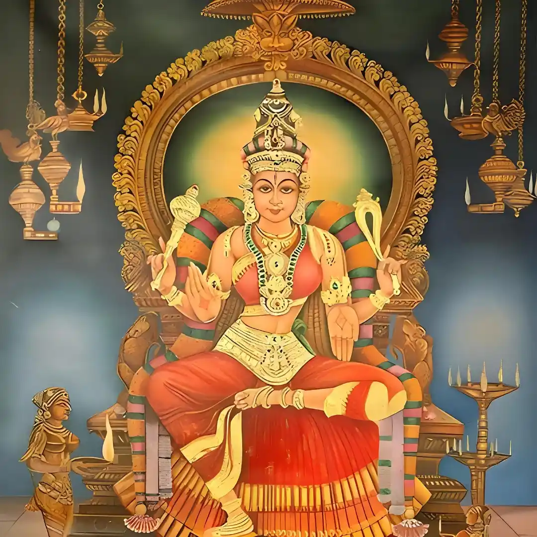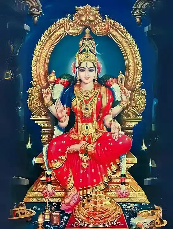 She sits on a golden throne amidst the solar system and controls success and failure in all our worldly undertakings. Thus, the karmic cycle comes into play at her will and command.