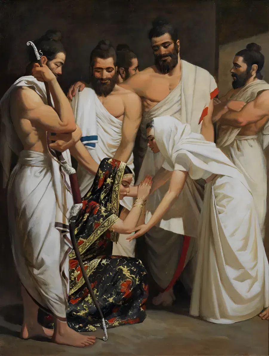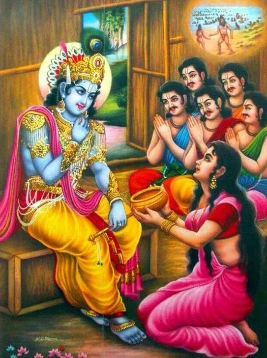 By divine providence, Queen Kunti was once cooking meals facing the opposite side. In humor, Arjuna introduced Rani Draupadi as alms. So too, without turning around, Devi Kunti ordered-