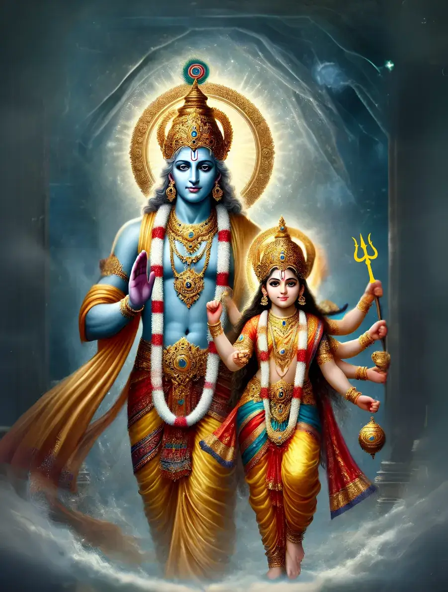 Sri Durga is the beloved sister of Sriman Narayana. At her insistence the Lord surely frees the jeeva from Samsara, seating him in His private airplane to the isolated domain of Vaikuntha, where boundless Ananda prevails.
